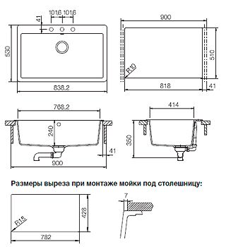 Размер мойки 530 x 838