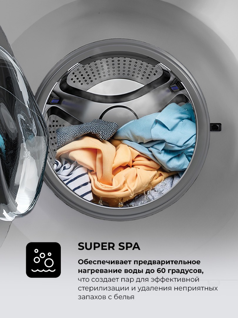 - Super Spa: программа предварительной стирки с нагревом воды до 60 градусов, обеспечивающая стерилизацию и дезодорацию белья в течение 30 минут.