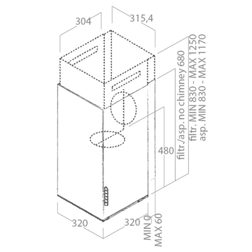 - Возможность установки, в вытяжной или фильтрующей версии, без верхнего дымохода, при условии нахождения на высоте 680 мм