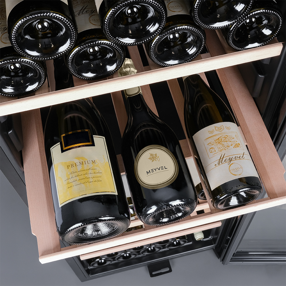 Meyvel MV133-KBF1 — отдельностоящее устройство, поэтому можно разместить его в любом удобном месте ресторана, отеля, бара или домашней винной комнаты без встраивания в мебель. Это удобно не только для создания стиля и атмосферы в интерьере, но и для предоставления легкого доступа к винам.