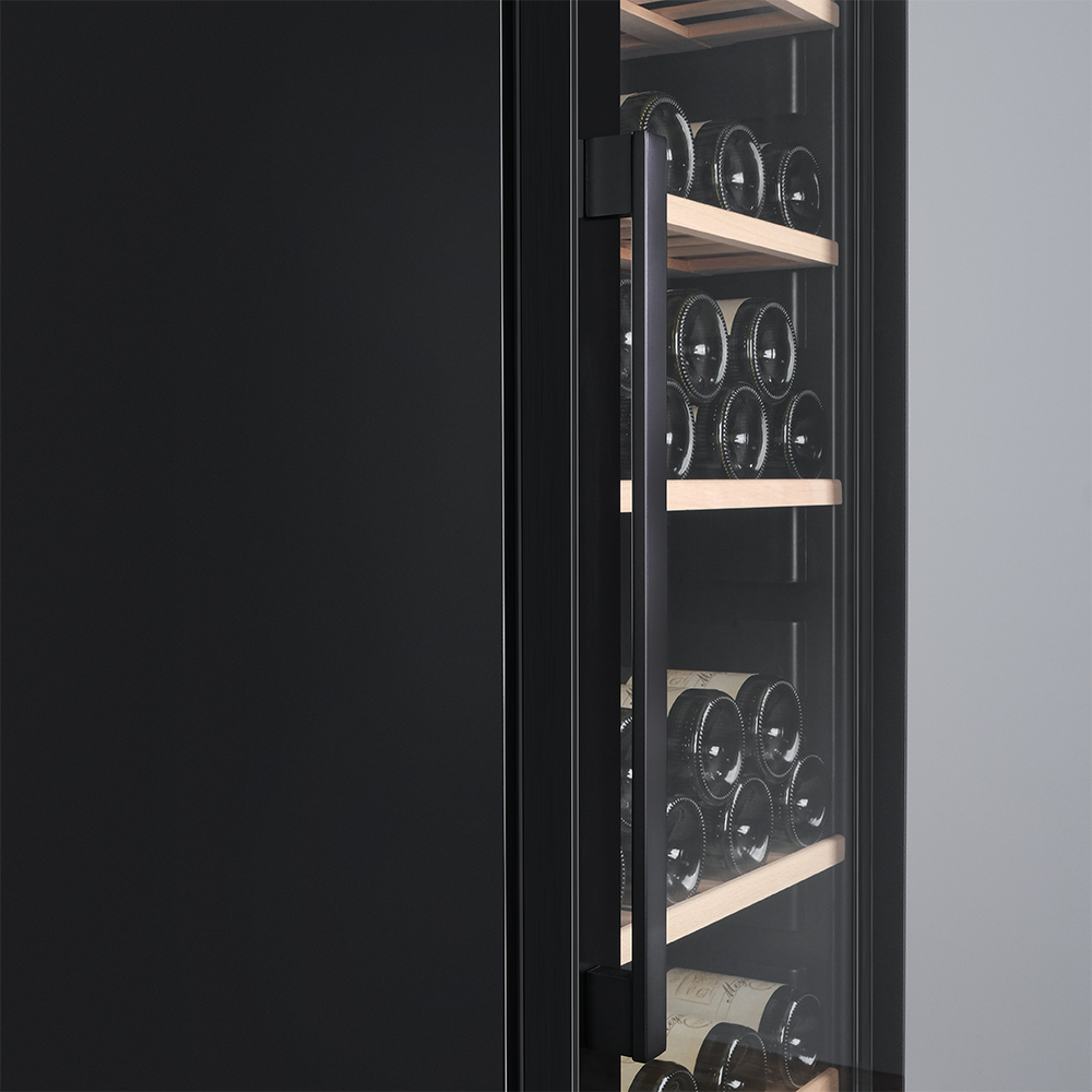 Управление осуществляется через сенсорную панель, а настройка интуитивно понятна. Также предусмотрены важные функции для защиты винотеки: замок на двери для безопасности, угольный фильтр, который очищает воздух внутри шкафа от посторонних запахов, сигнализация отклонения температуры, которая предупреждает о любых изменениях в условиях хранения, и блокировка панели управления, предотвращающая случайные изменения настроек.